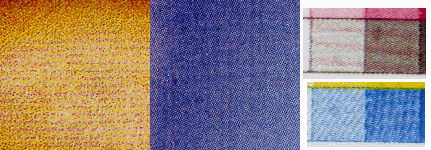 The HP samples, magnified, show the regimented row and column dot pattern. As described earlier, the halftone dot pitch is about 1/150'th of an inch. The Brother samples have the same magnification. Yet the HP printouts at normal viewing distance look smoother than those from the Brother. When more than one toner color appears, the various subimages' dots were not precisely superimposed which made darker color patches appear less grainy.