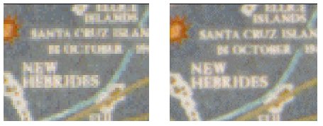 On the left is a portion of the 200 dpi scanned image after triple zoom by the computer software. On the right is the same portion of the 300 dpi scanned image at double zoom so as to show the material on the screen at the same physical size. The intent was to do pure magnification without "resampling" although JPEG compression loss makes these sample enlargements look as if some resampling took place.