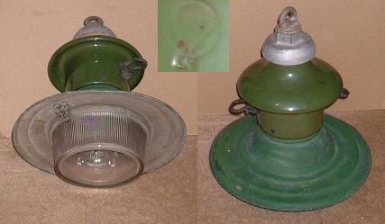 Many years ago I recall seeing from time to time a single open bottom streetlight with pie plate reflector hanging in the middle of an intersection from a span wire. I do not recall the locations. Estimated date of manufacture: 1930.